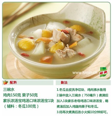 小贴士:秋冬天吃栗子和鸡肉绝对是非常出色的菜品组合,这一般是需要长时间的慢火煨炖才能消除彼此的生疏感,使用了精选优质老母鸡结合独特工艺的家乐老母鸡汤口味浓汤宝,就让这个过程大大缩短,仅仅通过三碗水+两种食材+一个家乐浓汤宝的321步骤,味道便能大幅度攀升,鲜香浓醇!