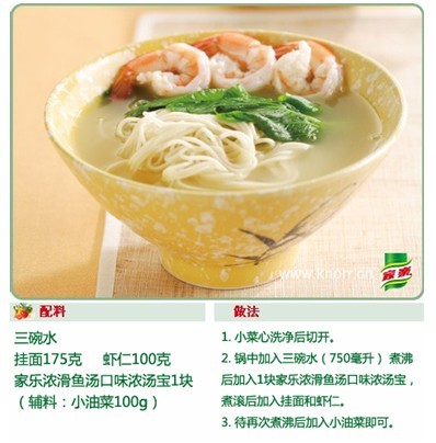 小贴士:鲜虾弹牙,油菜清脆,面条筋斗,尝一口就知道是你想要的!在优选鲫鱼与上等鳕鱼,独特搭配熬制的家乐浓滑鱼汤口味浓汤宝的调和下,让这一切食材在源源不断的奋力展现自身美味特质的同时,更加地相辅相成,和谐发展,让人从胃暖到心窝!