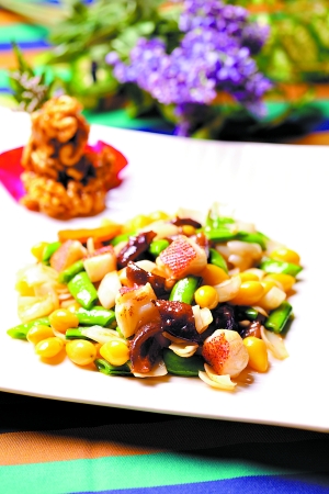 做法:选用游水东星和新鲜辽参,辽参切丁后用清鸡汤煨入味,而东星则用小量盐、蛋白和生粉略腌,然后烧红油锅,用橄榄油把辽参和东星煎至八成熟;百合和银杏、蜜豆先“飞水”,再用清鸡汤煨过,使之口感爽甜,最后倒入海鲜一起爆熟,鲜露做尾芡是口感倍加鲜美的小秘笈,清甜中别有一番华丽之感。