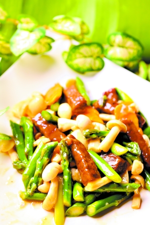 要调出肉类小炒的香气和鲜味,陈文志觉得鲜露是个不错的选择,在白肉菇芦笋炒澳大利亚牛柳这道菜里,尽管认为好牛柳只需简单味料腌制已是最好,但仍在最后打尾芡时用了辣鲜露,引发一份火辣的牛仔风情。