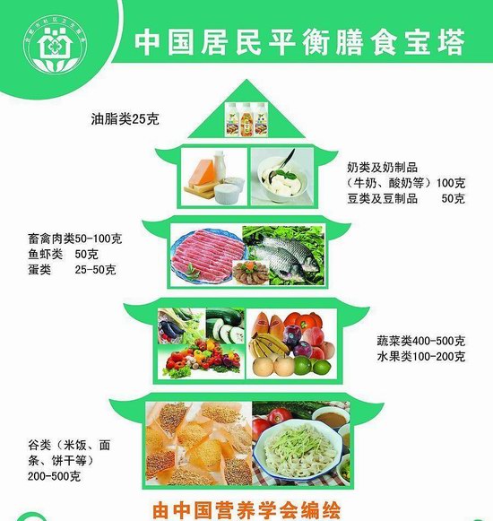 众所周知,人类必需的营养素多达40余种,这些营养素必须通过食物摄入来满足人体的需要。食物各有其营养优势,没有好坏之分,但如何选择食物的种类和数量来搭配膳食,却存在着合理与否的问题。为此,中国营养学会公布了《中国居民膳食指南》,为我们日常生活中的饮食营养给出了一个指导方案,并为我们建构了一座健康饮食的“膳食宝塔”。“膳食宝塔”共分5层,包含了人体每天所需的主要食物种类和数量。谷类食物位居底层,是日常所需的基础食物;蔬菜和水果占据第二层,它们包含大量维生素、膳食纤维、矿物质、植物化学物质,是人体正常活动必不可少的营养来源;鱼、禽、肉、蛋等动物性食物位于第三层;奶类和奶制品是第四层的主导者,牛奶的营养价值非常高,是人体钙的最佳来源;而第五层塔尖是油脂类。