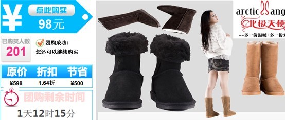 今年秋冬充斥网络销售渠道的北极天使雪地靴已经与各大团购网站成功上线购出近万双雪地靴,一鸣惊人的北极天使年末与可购可乐的联手团购高筒雪地靴活动已全面展开,虎年的结束才是北极天使的开始,相信在不久的将来,北极天使会像UGG一样成为家喻户晓的国民雪地靴品牌!