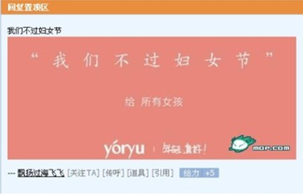 这篇人气论坛贴又是如何与悠语产生关联的呢?3月8日晚10时左右,一位署名为“飘扬过海飞飞”的网友在跟贴中发布了一幅图片回应,该图片呈粉红底色,写有“我们不过妇女节”的醒目主题,居中位置写着“给所有女孩”,落款处还附有一枚LOGO和“年轻•真好!”字样。
