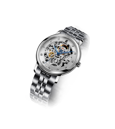 (型号: GS9155-2290;瑞士制造2892A2镂通自动机芯;21钻,镀铑处理,蓝色螺钉;依波路特制精美路易十四装饰花纹;不锈钢表壳,30米防水;表壳直径40.5mm;防反射蓝宝石水晶玻璃表镜;透视表底;表面镶嵌11粒天然钻石;带荧光蓝钢表针;精致打磨的不锈钢表带,配可靠表扣;全球限量550只)