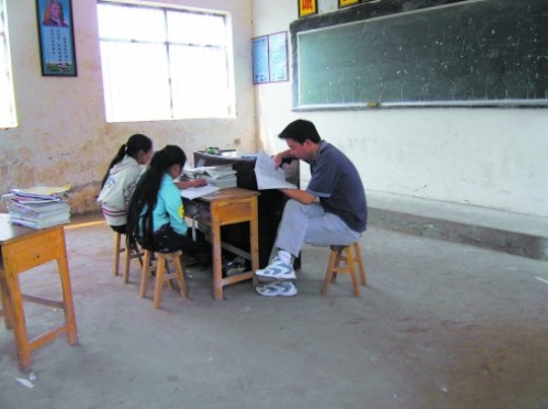 正在上的是英语课,任课老师罗东正在讲解英文单词的拼读。两名学生一边听,一边跟着念。“今天的单词,明天要抽背,接下来你们自己默写、巩固。”罗老师说, “班上本来有3名学生,但这周一开始,李海峰不知什么原因没来上课。现在学生是越来越少了。曾经想过让他们到7年级,有人想动员他们到其他学校去读书。但这几名学生家庭条件有限,不愿意走。没办法,只好继续将课上起走。”