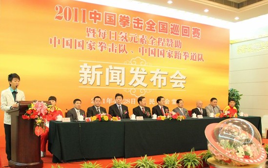 4月28日,北京国奥世纪资产管理有限公司在人民大会堂举办每日氢元素全程赞助中国拳击队、中国跆拳道队--暨“2011中国拳击全国巡回赛”新闻发布会。
