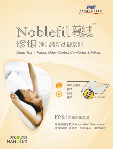一直秉承“坚持创新”的着名床品品牌SOMERELLE安睡宝品牌近日又推出一高科技功能性枕被——尊绒Nano-Tex净味清新枕被系列,该尊绒系列产品独家采用了美国Nano-Tex Neutralizer 面料纳米处理技术,产品面料经过此技术处理后,具有神奇的净味功能,能抑制消除被褥内由人体汗液等分泌物产生的异味。