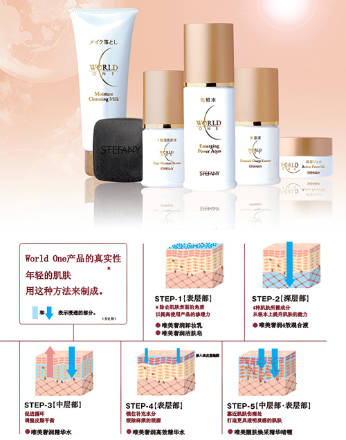 丝蒂芙尼唯美系列(World One)套装,由肌肤所需的胶原蛋白、弹力蛋白、透明质胶、以及合成中不可缺少的维他命C四种成分的100%原液,分别以10%的比例调和而成,融合纳米和核糖体两种技术,将所需成分直接派送到所需部位,被称为“直效特性处方”疗法的新一代护肤系列产品。所谓的“直效特性处方”是指将有效成分从肌肤的表面送达到肌肤深层源头,更高效地发挥效用的一种高科技技术。主要配方中的乳浆蛋白,是采用特殊处理方法从产后7天内山羊初乳中提取而成。促进纤维芽细胞的动力的同时,还赋予增加胶原蛋白数量的特性。此外内含的红糖精华可抑制黑色素的生成。世界先端技术孕育而生的唯美系列护肤产品,可保护因外界环境影响形成的老化肌肤,夜间实现由内而外的肌肤深层修复,焕醒再生机能。