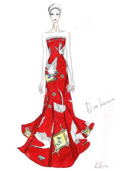 礼服以中国红为底,上绣展翅引吭的仙鹤,纤美的鹤舞九天图案在长长的拖地裙摆上更增大气姿态。九只形态各异的仙鹤翩舞缭绕中,一派脱俗气质更衬典雅之美,象征着和平。龙袍之后,范冰冰以不同以往的典雅之美再次向世界展示了东方女性的怡然风姿。该礼服的设计师是范冰冰的御用造型师卜柯文,这是他最新的“CHRIS BU”系列的代表作。