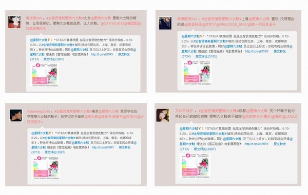 自2011-6-11 10:44 星期六女鞋(ST&SAT)发布“ST&SAT真情派票 抢览全智贤绝色魅力”活动时起,以迅雷不及掩耳之势在微薄上迅速传开,得到各界人士的支持与关注,大家纷纷表示了对全智贤在《雪花与秘扇》中的演出期待,可见,全智贤魅力难挡啊。抢票活动仍在如火如荼进行中,截止到06-13 14:45为止,参加人数已有3176人,想必未参加的童鞋们也正蓄势待发,信心满满。如果说,数字可以预见未来,可见,这场活动将会如何火爆。不要再犹豫,爱他(她),就带他(她)去看全智贤的《雪花与秘扇》,也望北京、上海、南京、成都、深圳五座城市的ST&SAT迷们或全智贤粉丝们奔走相告,让更多人加入到我们这次活动中来,一起享受时空的视觉饕餮,一起感受世间真情意。
