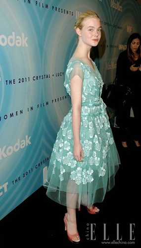 生于1998年的童星艾丽·范宁 (Elle Fanning) ,亮相2011露西水晶电影大奖( Women In Film 2010 Crystal And Lucy Awards )颁奖礼时,选择了刚刚举行发布会的Marc Jacobs2012早春度假系列婴儿蓝蕾丝透视裙,搭配Chanel2010春夏系列的高跟凉鞋