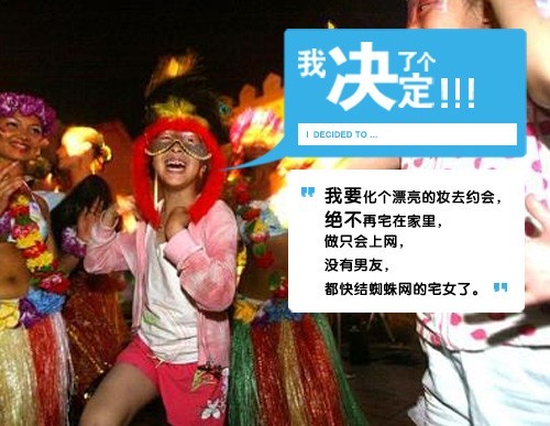 而这种敢于超越自我的积极情绪,也理所当然的引起了同样热爱时尚、向往美丽的年轻女性的青睐。她们热情的投入到了这场有关决定体的造句活动中,于是在网上可以看到很多时尚、年轻女性版的决定体造句。