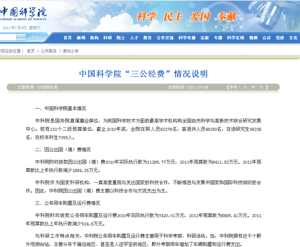 新华网北京7月9日电(记者吴晶晶)中国科学院日前在其网站上公布了“三公经费”情况说明。数据显示,中科院2010年“三公经费”财政拨款决算数为28711.28万元,今年预算数为24350.59万元,比去年缩减4360多万元。