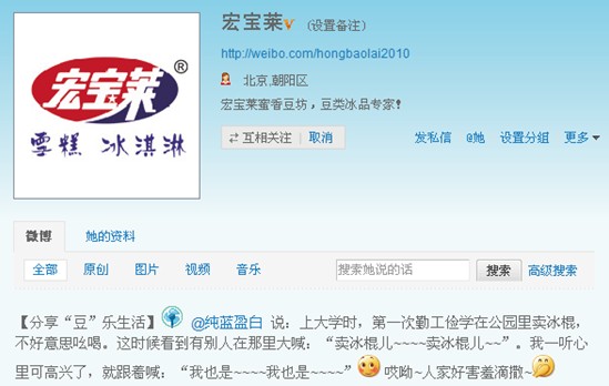 据了解,宏宝莱是国内优秀的冰品品牌,近年来围绕消费者需求,打造“蜜香豆坊”系列豆类冰品,倡导绿色健康消暑理念。为了更加贴近消费者,宏宝莱于今年4月份正式在新浪和腾讯两个平台分别建立了官方微博,博文内容以关爱校园人群为主,每日都会发布一些校园人群喜闻乐见的事情和一些在校园生活中实用的小贴士。微博贴心的内容和细心的维护为宏宝莱在两个平台上都带来了不错的消费者口碑,粉丝们都亲切的称呼自己为“豆伴”,很多粉丝自发的分享了儿时与宏宝莱一起留下的甜美回忆,激起了很多同龄人的共鸣。