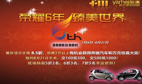 7月8日至8月21日,雅美整形美容项目全线8.5折,消费满2万元就可获得抽取豪华Smart汽车和万元神秘大奖的机会!享受雅美震世丰胸技法,你就有机会把豪华奔驰Smart汽车开回家!现在拨打美丽热线400-881-1144或者登录官方网站:http://www.csyamei.com抢占先机吧!