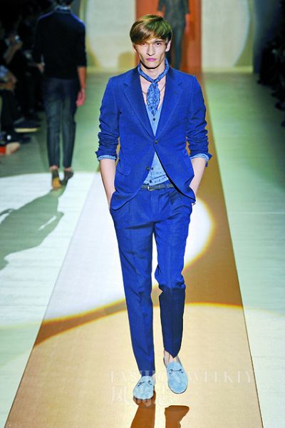 拜牛仔面料所赐,单宁原色成为一种大势所趋的蓝色体现。在Prada,牛仔面料乃是整体行头的唯一材质,仅用色差区分彼此;在Gucci,牛仔面料褪去了粗犷的原生质感,印花丝巾搭配西装、狩猎装等基本款服饰,弥漫着1970年代的精致Dandy风格。