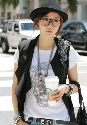 纯白色的半袖衫,清新的色彩,带来了非常清爽的感觉,精美的骷髅头像,给人以非常个性的欧美街头风,细腻的面料,亲肤的感觉,穿着起来非常的舒适,外搭黑色的小马甲,挺括的质感,显露干练帅气的色彩。