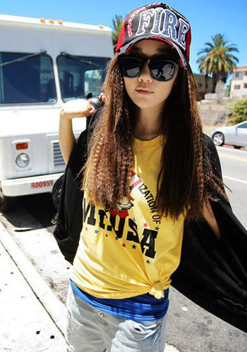 嫩黄色的精美T恤,鲜艳靓丽的色彩,透露出甜美时尚的青春活力,细腻而具有亲肤质地的纯棉面料,绝好的透气效果,穿着起来非常的舒适,精美而立体的印花图案,透露出酷酷的街头风