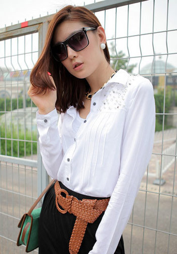 纯白色的衬衫,亲肤感觉的纯棉面料,穿着起来非常的舒适,挺括而有型的小翻领,给人以一丝浪漫的干练味道,肩部采用了铆钉的设计,更加的个性时尚,纯净的色彩,增添了浪漫感。