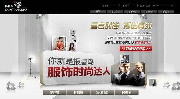 无论你是以成熟稳重为定位的型男,还是以阳光活力为标榜的帅哥,SHOW出来才最关键;无论你是睿智冷艳的知性美女,还是娇柔清灵的感性美眉,SHOW出来才更重要!“型”是一种姿态,也是一种快乐。因此,“宣传时尚、秀出真我——你就是报喜鸟服饰时尚达人”活动正在塑造一片属于大众的SHOW平台。