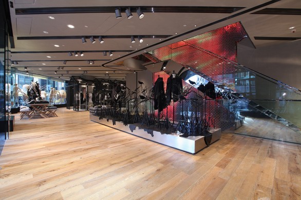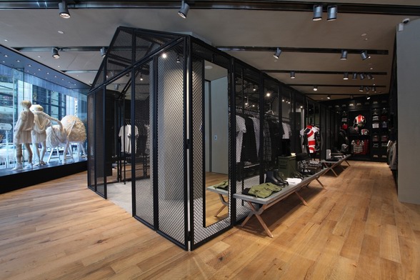 左边izzue ARMY专门店采用了崭新的军事设计格调,与别不同。粗糙橡木长条地板和水泥色凹凸不平的墙身散发著那粗犷军事味道,正中间筑起的黑色铁枝笼架是有如军营一样的设计,内里摆放著品牌既流行又多元化的衣饰。围绕著店铺内墙是一组组储物柜样式的黑色陈列柜,充满格调的设计配以金属摆设,呈现出非凡的潮流味道。