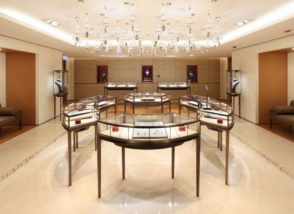 精品店的法式建筑风格承袭了卡地亚一贯的显赫气派与浪漫气质。两层高的玻璃幕墙上嵌有法式大道典雅的遮阳蓬。精品店的外围入口处由一座拱形的玻璃墙打造而成,正上方巨大鲜明的卡地亚标志,展现出慑人的非凡气势。精品店采用双层复式空间设计,总面积逾747平方米。店外的幕墙以深色花岗岩砌筑而成,其精细抛光与原始磨砂表面设计的巧妙结合,尽展品牌对细节的一丝不苟和极致追求。