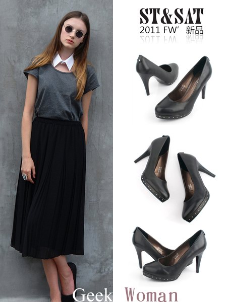 一气呵成,利落干脆,却在鞋底细节之处加上ROCK元素,正如Geek Woman端庄、斯文的外表下隐藏着一颗闷骚的心。精选优质羊皮打造,配合经典楦型和稳固防水台,优雅长存的款式是穿梭于朝九晚五的OL们最保险的选择,但ST&SAT同时赋予了它们自己的性格,星期六的晚上,你大可抛弃通勤装的束缚,穿上这双有着金属铆钉点缀的黑色高跟鞋,演变成ROCK之夜里的闪耀焦点,唤醒与众不同的知性魅力。
