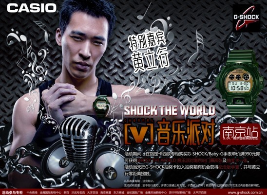据了解,在此次SHOCK THE WORLD音乐派对上,G-SHOCK品牌代言人黄立行将亮相派对现场,在乐海音浪中,与现场年轻潮人一起HIGH爆金陵九月天。即日起至9月23日,在卡西欧手表指定店铺购买G-SHOCK/Baby-G系列手表单价满990元,即可获得SHOCK THE WORLD音乐派对南京站门票两张及抽奖卡一张,一场潮人专属的视听饕餮盛宴不容错过,更多活动请关注G-SHOCK官网www.g-shock.com.cn。