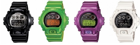 G-SHOCK经典型号DW-6900系列,增加现今流行的绚亮色彩,亮黑色,绿色,紫色,白色闪亮登场;表带部分采用特殊的印刷设计,增添闪亮度和动感。