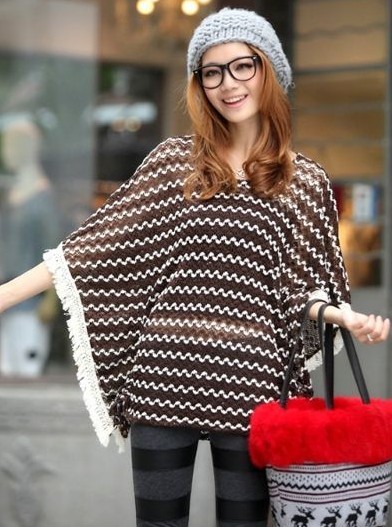 一款斗篷式毛衣,非常可爱,面料非常的独特罕见哦,波浪撞色编织并嵌有小珠片的设计,工艺非常复杂。下摆处更有甜美的白色棉质流苏,袖子下摆处有抽绳,可以调节袖子与衣身两侧的高度哦,抽起来就会有皱褶的效果,相当甜美可爱。
