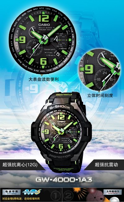 Absolute Toughness! G-SHOCK近期将推出SKY COCKPIT新款GW-4000-1A3,以航空理念为设计源泉,并以将防震、耐振动、抵御极端重力集于一身的三重triple G概念研制开发,强大的功能和炫酷的外型将为这表款塑造前所未有的震撼,同时也为这个寒冬添上一抹自由飞翔、极致坚韧的色彩,将单调的冬季丰富起来,将TOUGH进行到底。