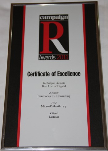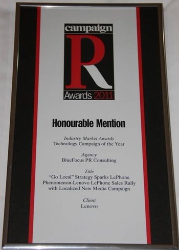 公关界年度盛事“2011亚太公关大奖(2011 Asia-Pacific PR Awards)”,30日在香港万豪酒店隆重揭晓。蓝色光标公共关系机构喜获两项大奖:“联想微公益”案例荣获“数字营销类(Best Use of Digital)”的“杰出表现奖(Certificate of Excellence),是该类别仅有的两个得奖案例之一; 蓝色光标分区团队的“乐Phone 23区域新媒体营销战役”案例荣获 “高科技行业类(Technology Campaign of the Year)”的“荣誉奖”(Honorable Mention),是该类别仅有的三个得奖案例之一。这两个奖项的获得,充分体现了蓝色光标“专业立身、卓越执行”的服务理念,也彰显了公司近年来“数字营销战略”和“区域发展战略”的实力和成果。
