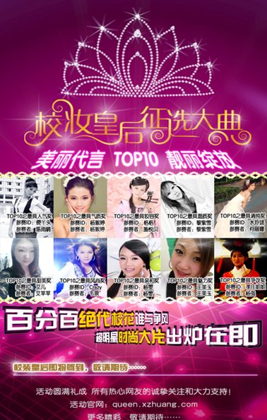 近日,由中国首家大学生化妆品网上购物商城——校妆网发起的“校妆皇后”征选大典吸引了近千名校花争相媲美,数万名网友热烈追捧,经过为期一个月的火热征选,通过网友热心投票,并由美男评审团在人气排名前40名中审慎甄选,终于在2012年4月12日,迎来了校妆皇后TOP10的靓丽绽放,凸显了90后一代对美丽的个性诠释,并将在2012年4月16日隆重册封“校妆皇后”,成就了名副其实的“90后美丽代言”。