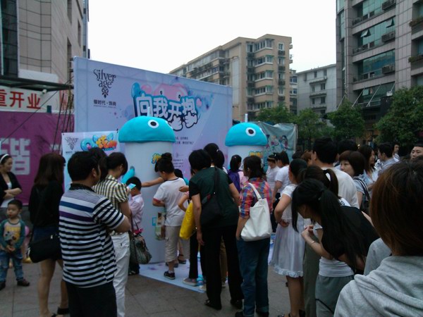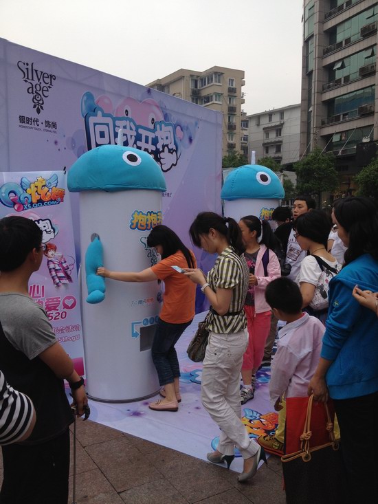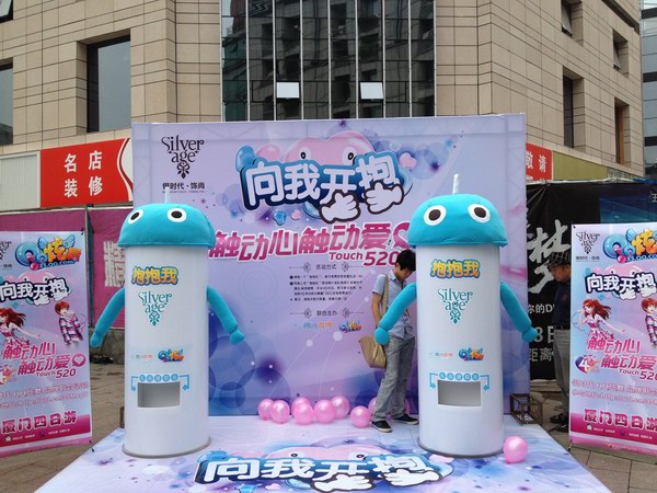 周边还有一些疑是活动发起者在拿着DV机拍摄人群的不同反应,上前询问才得知,这是银时代与腾讯联合举办,特别于520期间推出的主题活动。记者随即电话采访了银时代品牌部新闻发言人陈经理,“要让快乐传播开来!我们的“抱抱机”只是基于这样一个简单的初衷”他解释到,“组织这场活动,是银时代向大家倡导现代社会人与人之间距离的拉进,一个真诚的拥抱,会让一切都变得更加美好,为生活带去积极、乐观和乐趣。”他还表示,这次活动银时代与腾讯合作,在线上同期展开,不论你亲身拥抱“抱抱机”或是通过网络体验这个活动,我们的目标都是相同的——传递爱与快乐。此活动反响很热烈,人们对此乐此不疲,甚至出现了4到5个人同时拥抱“抱抱机”并相互拥抱的场景!这实在是很感人。”