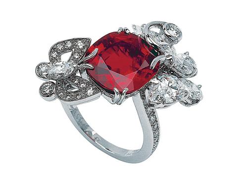 让这一抹充满热情的红色,表达爱与渴望:白金镶多面形、马眼形及梨形切割钻石,配衬7.04克拉长角阶梯形切割缅甸红宝石。