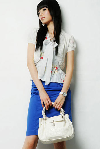 搭配亮点:蕾丝、印花一样都不想放弃,正在流行的钴蓝色中筒裙成为上班装的最好注脚。