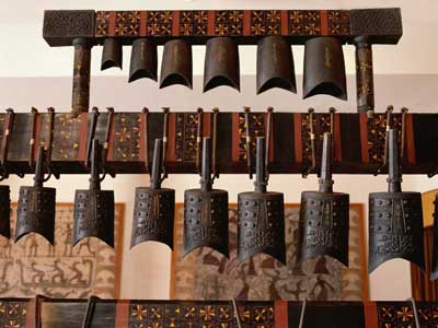 1978年湖北随县城郊的擂鼓墩出土战国初期的曾候乙墓编钟,共六十五枚。被称为我国古代编钟之王,每个钟体上都刻有错金篆体铭文,正面刻“曾候乙乍时”(曾候乙作)。