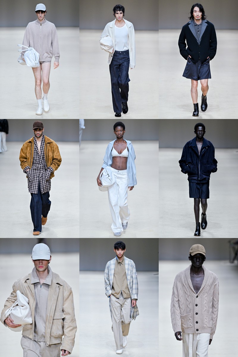 秀场氛围的营造同样呼应主题精髓。柔和的自然光源模拟午后阳光,将面料的细腻质感清晰呈现;简约舒缓的钢琴旋律流淌全场,与整体极简慵懒的格调完美契合。本次发布的家居服系列中,模特以无妆感妆容搭配自然卷发,身着米白大衣配真丝睡衣、炭黑皮衣搭缎面睡衣等造型缓步前行,将“毫不费力的优雅”具象化,简洁造型中尽显高级质感。