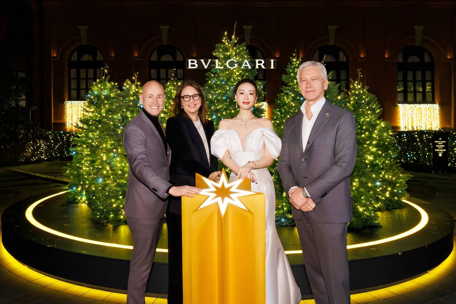 上海宝格丽酒店总经理戴万杰(Matthias Terrettaz)先生携手意大利驻沪总领事安缇雅(Tiziana D'Angelo)、宝格丽大中华总裁穆嵩喆 (Mauro di Roberto)以及演员高叶共同点亮节日艺术装置。缀满璀璨华饰的节日之树于光影流转间熠熠生辉,映照每一个欢欣共庆的时刻。