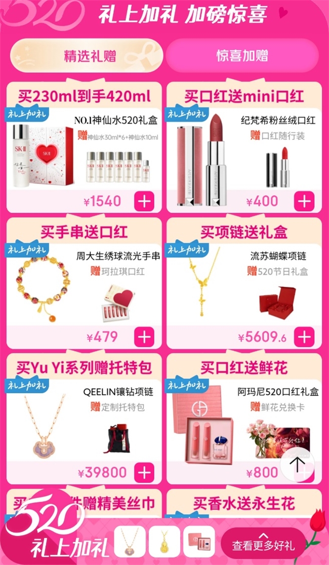 520将至,挑选一份让TA心动的礼物,传递真挚爱意吧。5月13日,京东服饰美妆心动购物季全面开启,携手赫莲娜、阿玛尼、浪琴、SK-II、兰蔻、周大生等国内外大牌,带来美妆护肤、黄金珠宝、奢品、钟表眼镜等全品类浪漫好物,现货开卖不用等。活动期间,在京东APP搜索“礼上加礼”进入会场,不仅可享跨店每满200减30、送礼专享85折、购物卡充500得520等多种优惠,更有买礼物加赠鲜花、电影票、金贴、口红礼盒、丝巾等惊喜礼,让爱意双倍抵达。