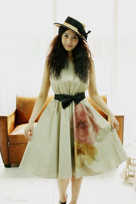 素色印花大摆连衣裙,闲适自然。腰间的蝴蝶结腰带束出芊芊细腰。带上草帽,