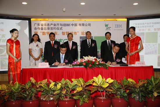 8月26日,广东省信息产业厅与国际着名的信息技术和服务公司IBM(NYSE: IBM) 签署战略合作备忘录,双方将加强在信息技术和信息服务领域的合作,携手共同推进“数字广东”建设。签约仪式后还举办了“数字广东,智慧城市”论坛,展示了广东省以城市为重心,以信息技术为基础,向高价值、高科技产业转型,向都市化、数字化的和谐社会迈进的重要战略发展方向。广东省政府副省长佟星、副秘书长林英,广东省信息产业厅厅长温国辉、副厅长邹生,IBM大中华区董事长及首席执行总裁钱大群、IBM全球副总裁、大中华区政府与公众事业部总经理范宇以及IBM华南区总经理张少刚等代表共同出席了签约仪式。省直有关单位,有关地市信息产业主管部门,以及相关企事业单位负责人参加了活动。根据广东省信息产业厅和IBM签署的战略合作备忘录,双方将携手推动广东省在新起点上争创新优势,依托信息技术,抓住数字变革的机遇,大力推进“数字广东”建设,力争广东再次成为中国经济转型和科学发展的排头兵。