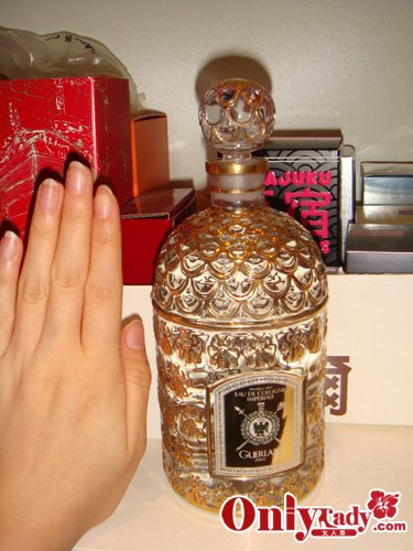 两款娇兰的香水。上面一瓶瓶身非常巨大,可以看与手部的对比照。