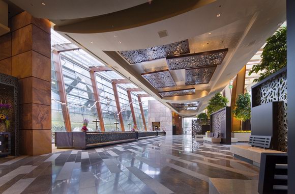 由世界知名的建筑机构 Pelli Clarke Pelli 设计,ARIA 的建筑效果在各方面都别具一格,从两座壮观的曲线钢玻璃塔楼到自然资源的清洁使用,包括大量的叶饰、木制物和石头。