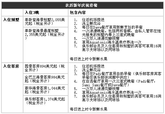 即日起至2010年3月底,度假村推出的农历新年浪漫欢庆套餐将带来极致奢华的感受,入住度假村三晚只需894美元/客房起。为所有入住度假村的宾客带来:
