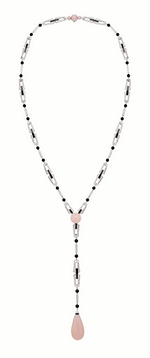 VALENTINA长项链,透着粉嫩色泽的粉红蛋白石搭配806颗圆形美钻(18.30克拉)与100颗梯形车工美钻(11.82克拉),镶嵌成线条流畅的Y字型长项链,缀以典雅的缟玛瑙,展现女性时尚优雅的姿态。