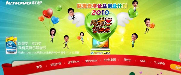 去年,2009年联想青年公益创业计划于引发了巨大社会反响。在短短一个月的报名期内,就收到10,469份提案作品,120多万人加入“飚爱族”讨论公益创业,超过600多万的青年人通过网络关注并支持活动。“爱益族”、“CYCAN”等全国10强脱颖而出,获得了联想的全面支持。