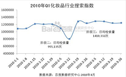 百度数据显示,除春节期间,2010年第一季度化妆品行业搜索指数走势平稳,有上升态势,日均检索量为1,309,741次。根据检索量将搜索指数分成三个阶段。阶段一为1月1日至2月10日。元旦至春节前夕,化妆品行业整体搜索指数稳中有升,日均检索量为1,309,741次。阶段二为2月11日至18日。受春节长假影响,行业整体检索量大幅度下降,日均检索量仅为955,135次,比前一阶段下降了25.28%。阶段三从2月19日至3月底,期间日均检索量提升,达到1410,332次,春节过后网民对化妆品相关内容的检索需求较节前大幅提升,同时与第一阶段相比也有一定程度的增加,日均检索量比第一阶段提升10.33%。
