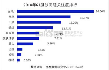 2010年一季度数据显示,肌肤问题中色斑/暗沉关注度最高,占比为26.66%,痤疮关注度18.57%排名第二,干燥、皱纹、黑眼圈分别排名三到五位。
