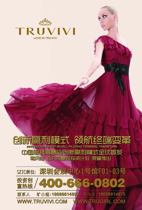 楚阁(国际)时装旗下品牌TRUVIVI将于第十届中国(深圳)国际品牌服装服饰交易会其间进行 “创新赢利模式 领航终端变革”——中国服装零售业创新赢利模式全球首发。现场特邀新经济时代创新经营大师张果宁教授震撼亮相,为你解读第四代女装创新商业赢利模式产业革命的密码!